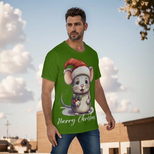 Mens Short Sleeve Christmas Tee - Green - Cute Mouse