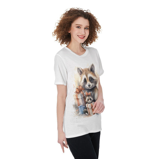 Women's Short Sleeve Christmas Tee - Watercolour Cute Raccoon