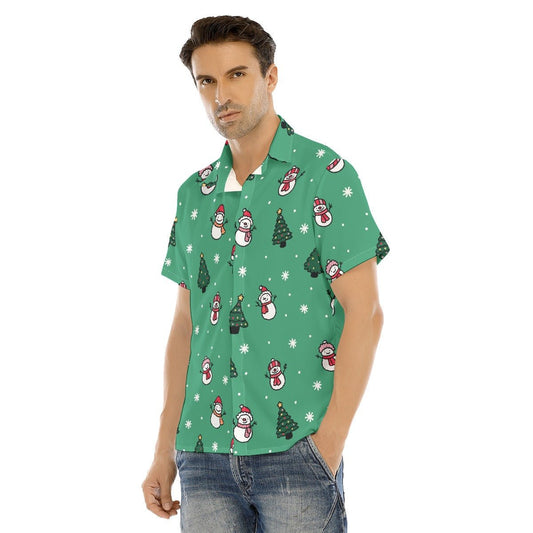 Men's Collar Short Sleeve Christmas Shirt- Green Snowman