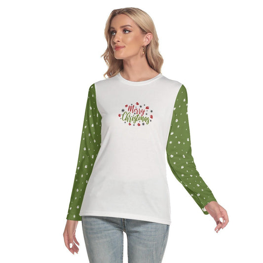 Women's Long Sleeve Christmas T-shirt - Merry Christmas - Green Sleeves