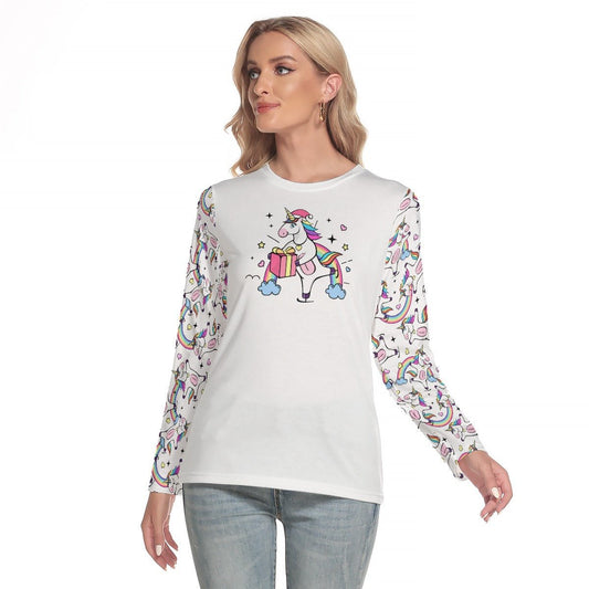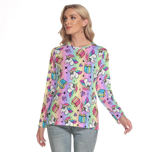Women's Long Sleeve Christmas T-shirt - Unicorn with Present